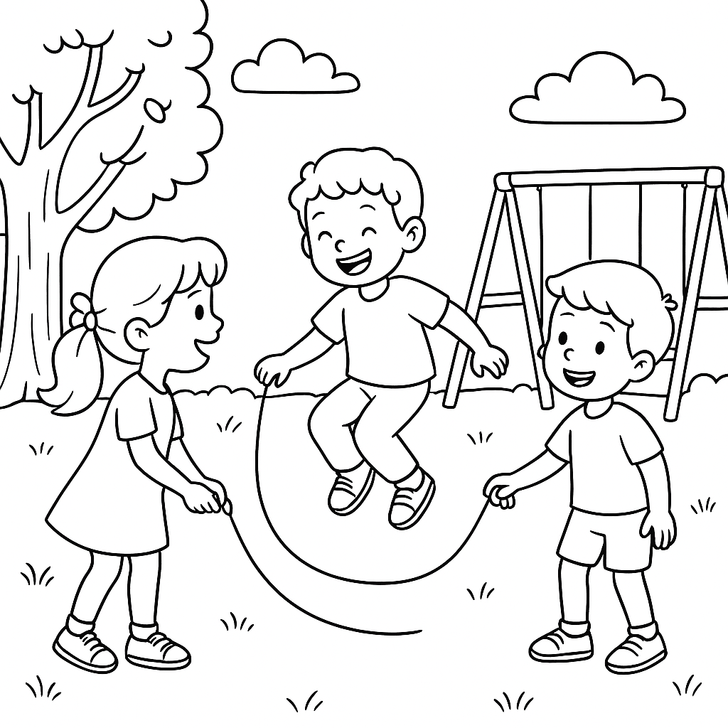 A medium coloring page featuring children playing jump rope on playground. Perfect for kids (6-9) with moderately detailed outlines for a fun coloring experience.