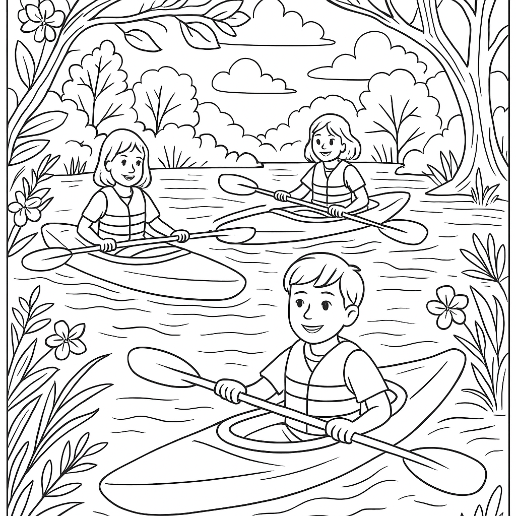 A detailed coloring page featuring children kayaking on calm spring river. Perfect for tweens (9-12) with intricate detail for a fun coloring experience.