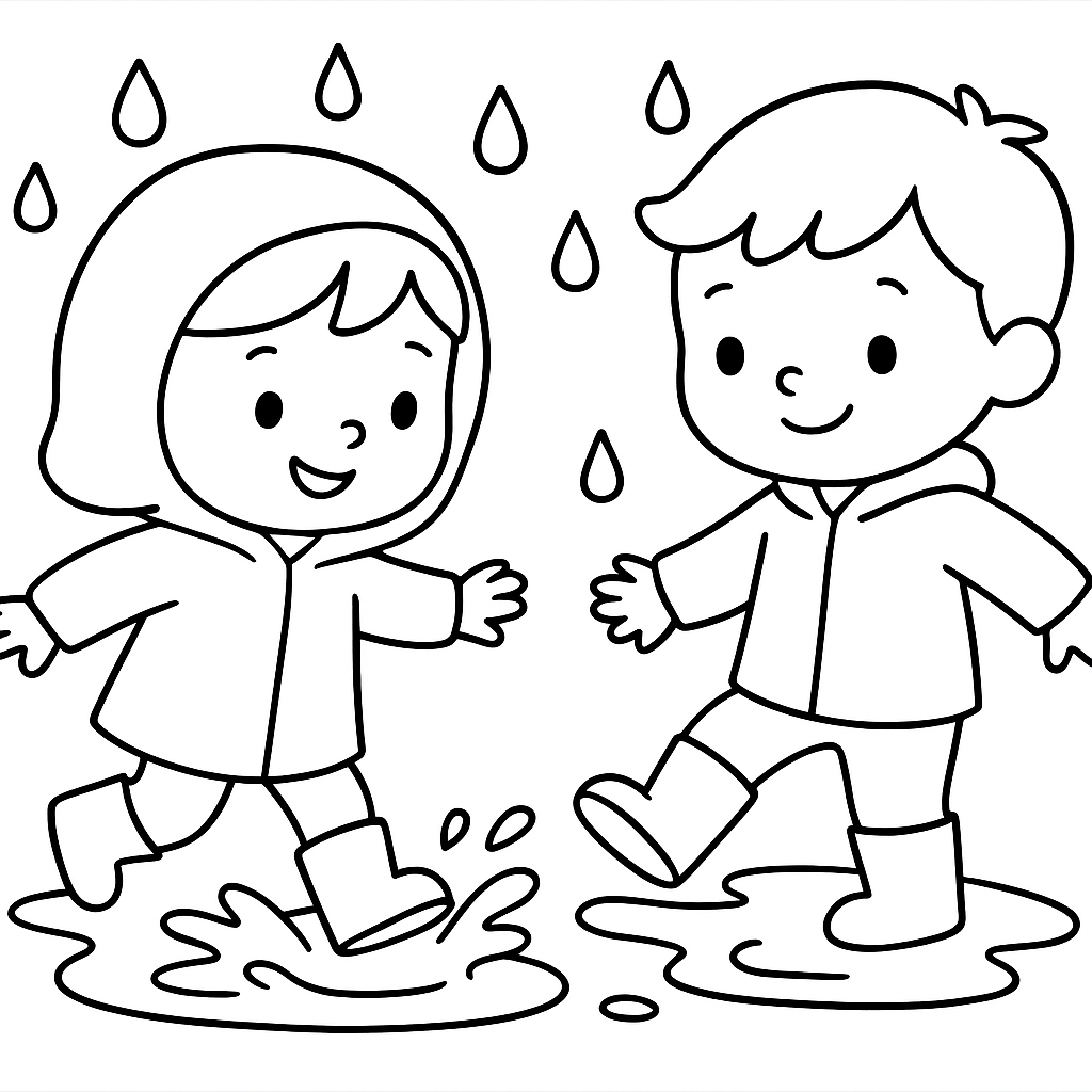 A simple coloring page featuring children splashing in spring rain puddles. Perfect for toddlers (2-4) with large, bold outlines for a fun coloring experience.