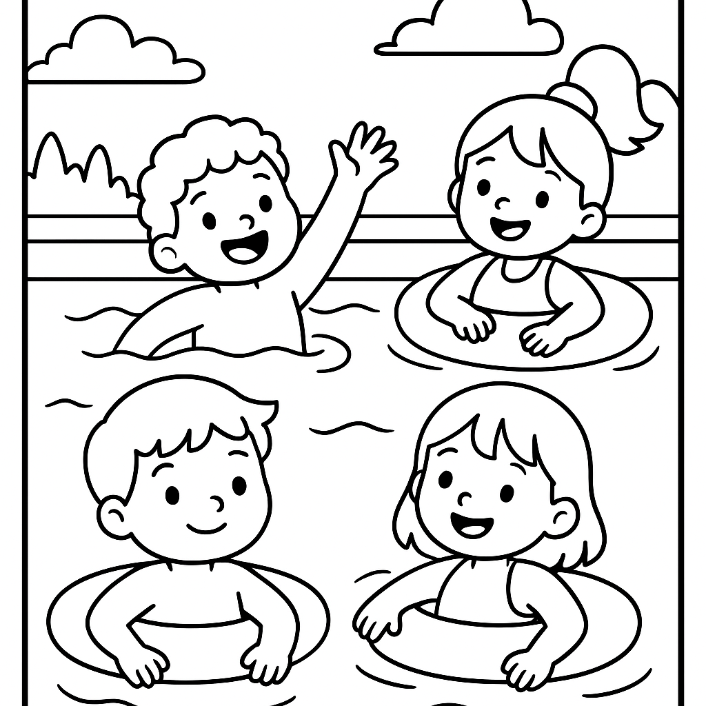 A simple coloring page featuring children swimming in outdoor pool with floaties. Perfect for kids (4-6) with large, bold outlines for a fun coloring experience.