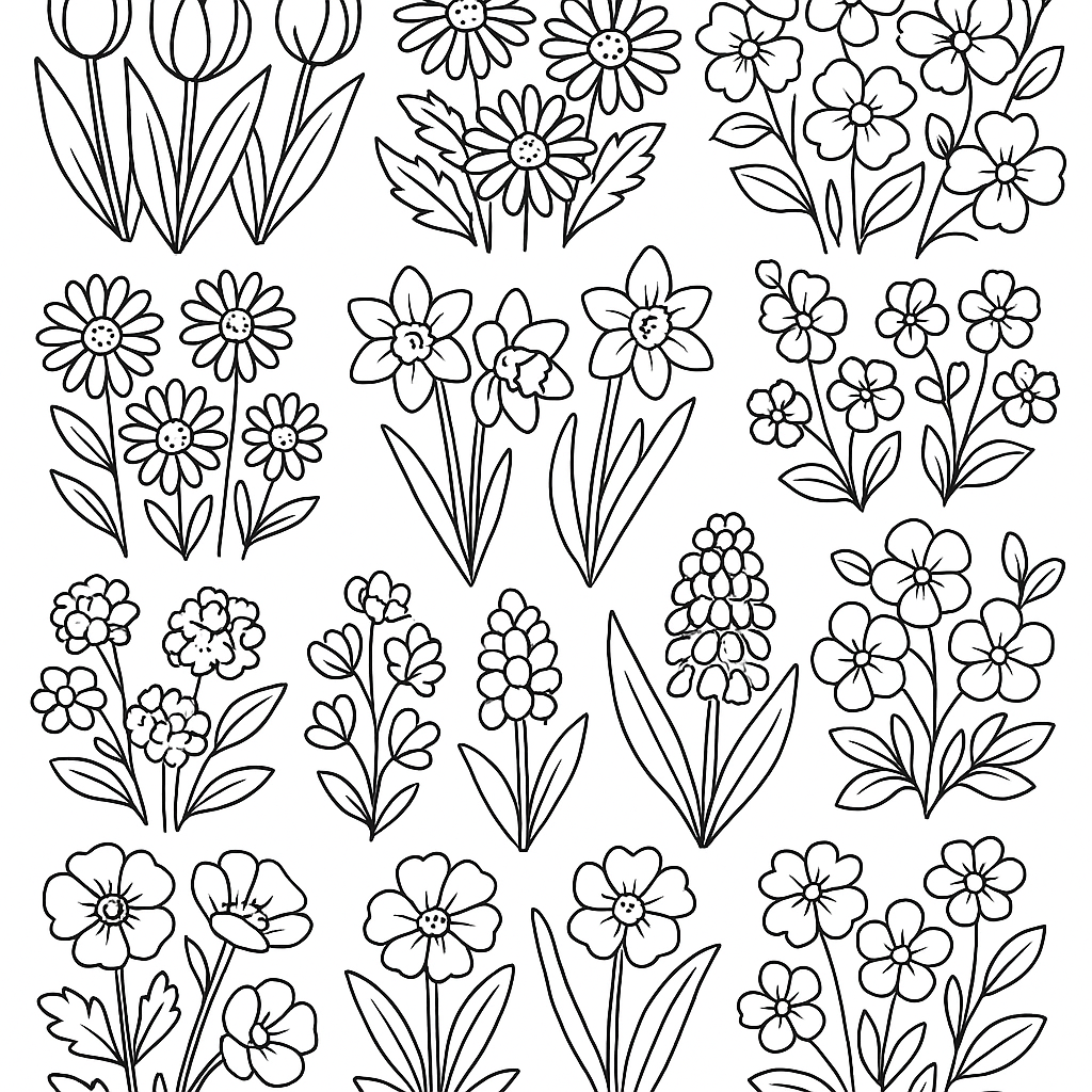 A medium coloring page featuring 100 spring flowers arranged in groups of ten. Perfect for kids (6-9) with moderately detailed outlines for a fun coloring experience.