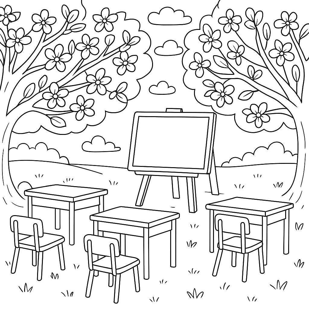 A medium coloring page featuring outdoor classroom setup under blooming trees. Perfect for kids (6-9) with moderately detailed outlines for a fun coloring experience.