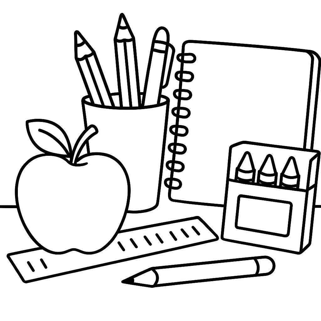 A simple coloring page featuring school supplies arranged on desk for new year. Perfect for kids (4-6) with large, bold outlines for a fun coloring experience.