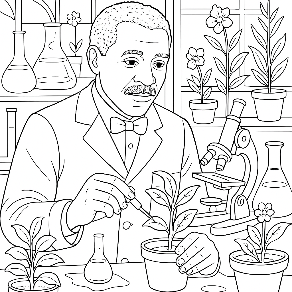 A detailed coloring page featuring George Washington Carver in laboratory with spring plants. Perfect for tweens (9-12) with intricate detail for a fun coloring experience.