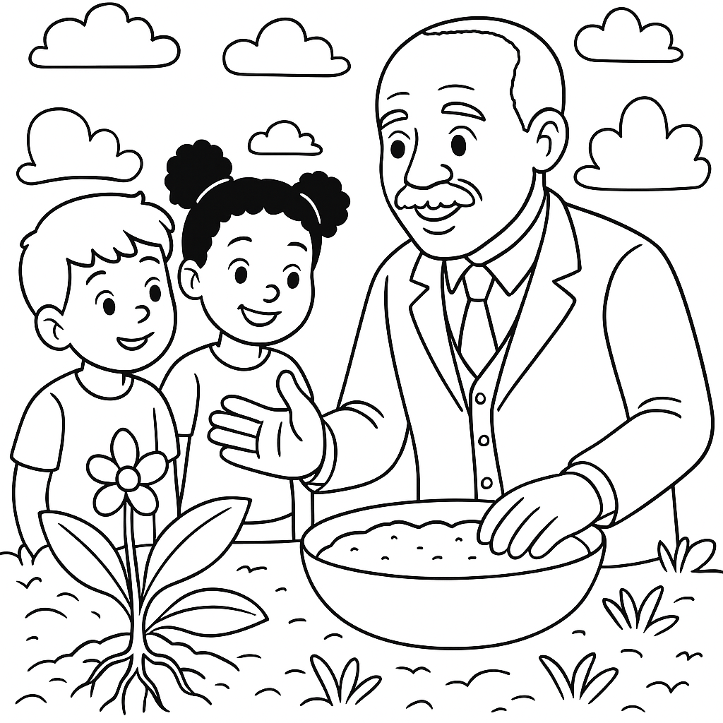 A medium coloring page featuring George Washington Carver teaching about plant cultivation and soil. Perfect for kids (6-9) with moderately detailed outlines for a fun coloring experience.
