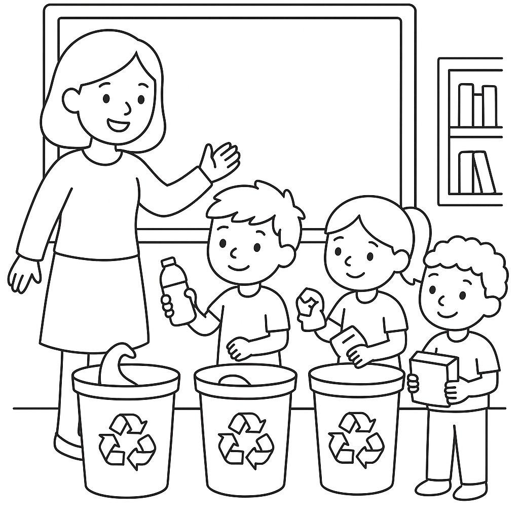 A simple coloring page featuring classroom recycling sorting activity scene. Perfect for kids (4-6) with large, bold outlines for a fun coloring experience.