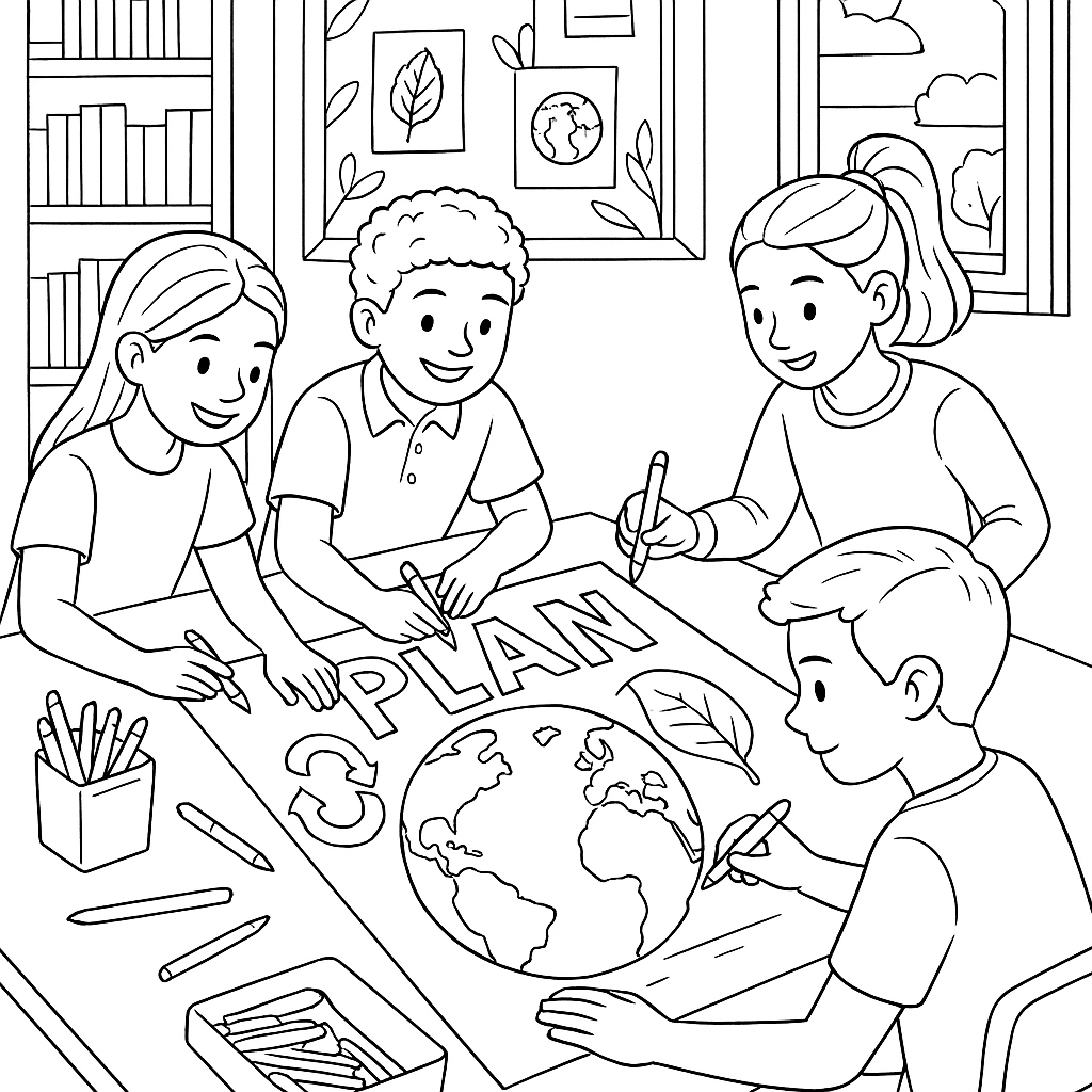 A detailed coloring page featuring students creating an environmental action plan poster. Perfect for tweens (9-12) with intricate detail for a fun coloring experience.