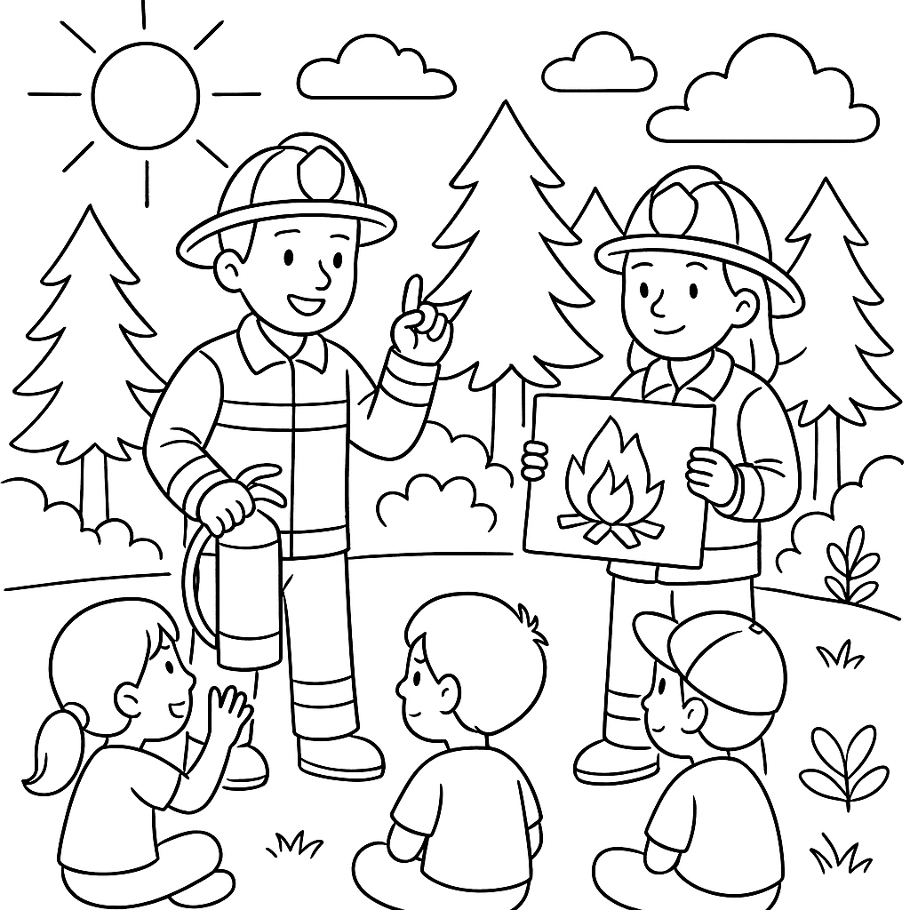 A medium coloring page featuring firefighters teaching about preventing spring wildfires. Perfect for kids (6-9) with moderately detailed outlines for a fun coloring experience.