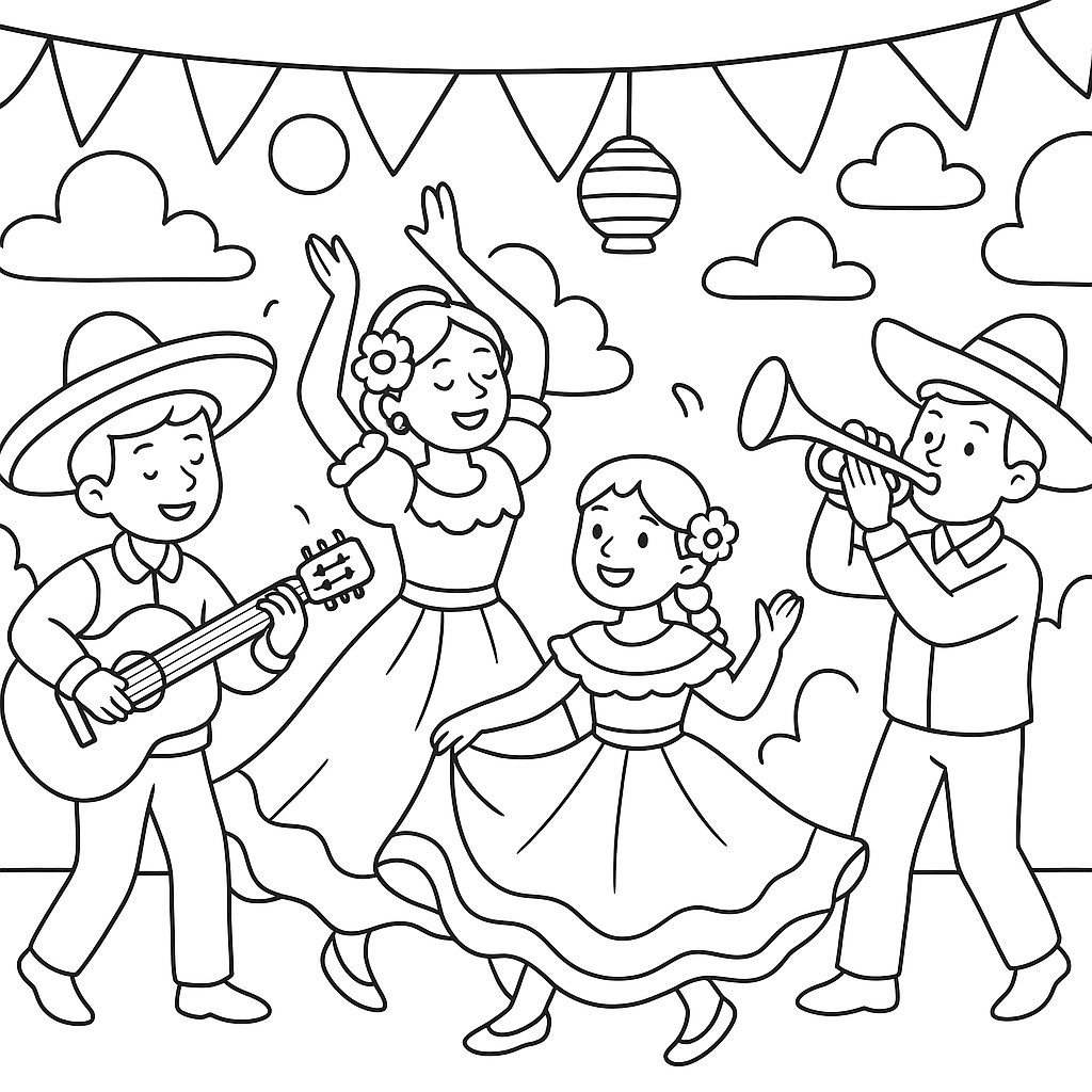 A medium coloring page featuring traditional hispanic festival with music and dance. Perfect for kids (6-9) with moderately detailed outlines for a fun coloring experience.