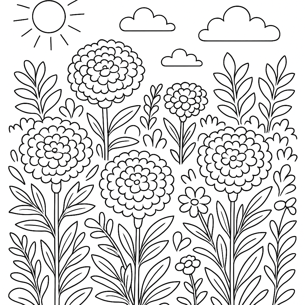 A medium coloring page featuring traditional Mexican flower garden with marigolds. Perfect for kids (6-9) with moderately detailed outlines for a fun coloring experience.