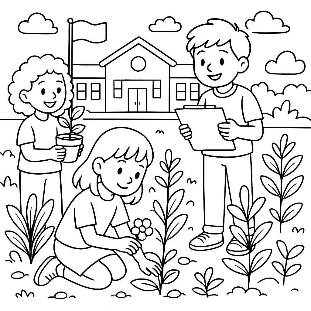 A medium coloring page featuring students learning about plants in a school garden. Perfect for kids (6-9) with moderately detailed outlines for a fun coloring experience.