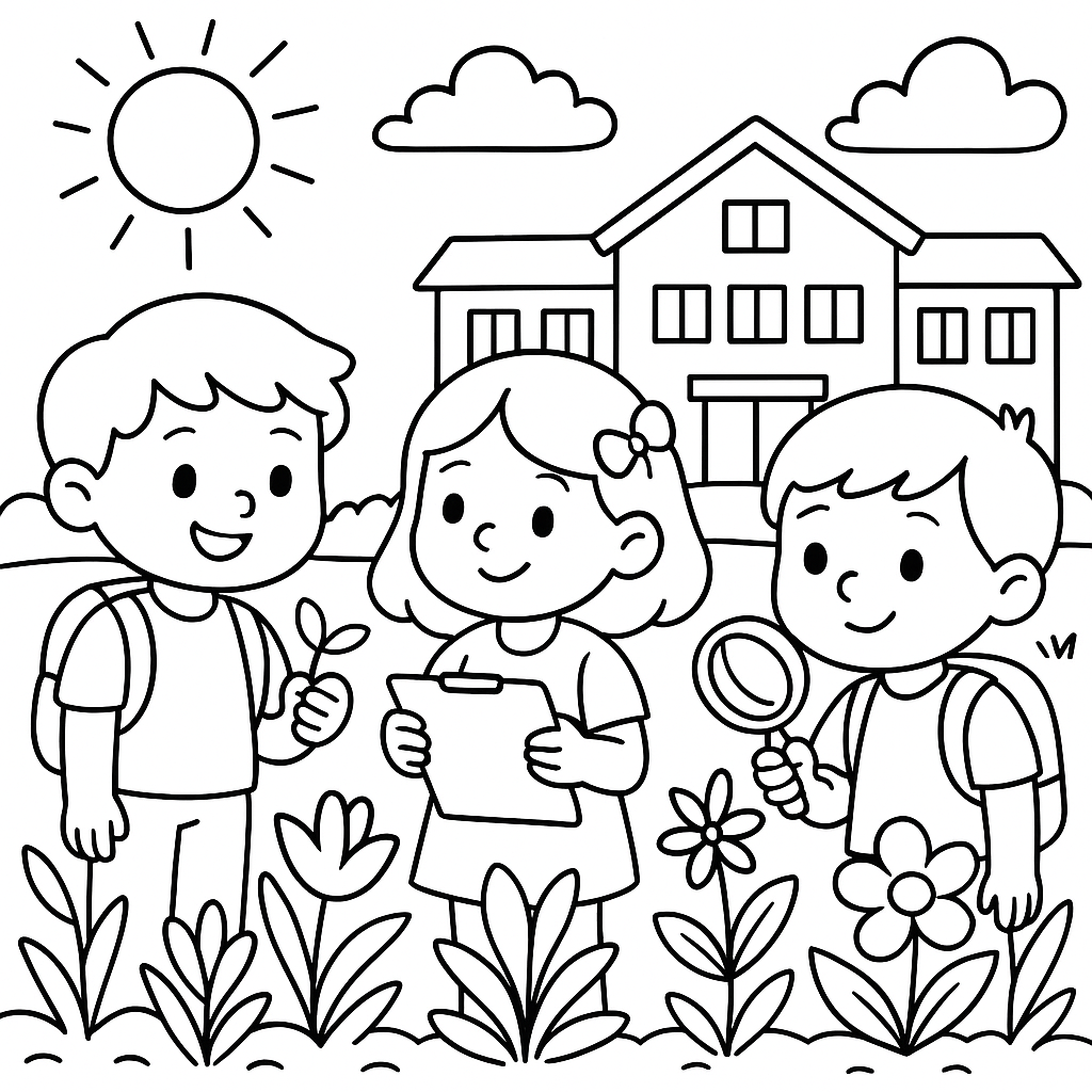 A simple coloring page featuring students learning about plants in school garden. Perfect for kids (4-6) with large, bold outlines for a fun coloring experience.