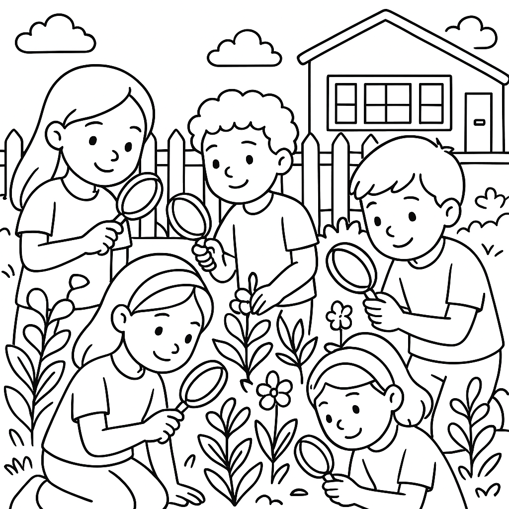 A medium coloring page featuring students studying plants in school garden with magnifying glasses. Perfect for kids (6-9) with moderately detailed outlines for a fun coloring experience.