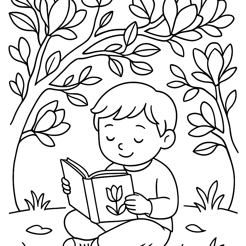 A medium coloring page featuring child reading poetry book under blooming magnolia tree. Perfect for kids (6-9) with moderately detailed outlines for a fun coloring experience.