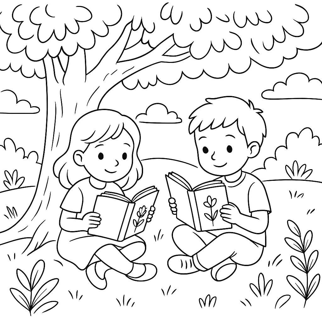 A medium coloring page featuring children reading nature poetry under tree. Perfect for kids (6-9) with moderately detailed outlines for a fun coloring experience.
