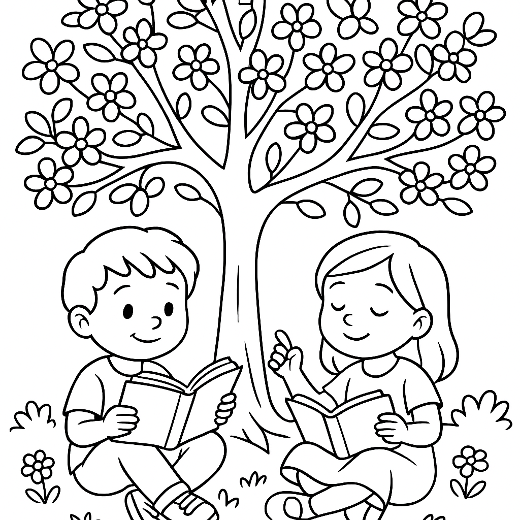A medium coloring page featuring children reading poetry under a blooming tree. Perfect for kids (6-9) with moderately detailed outlines for a fun coloring experience.