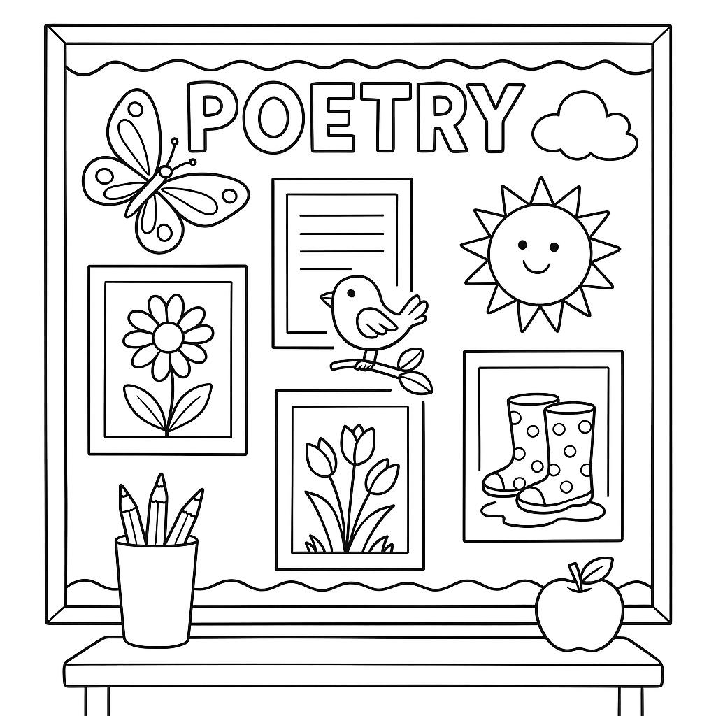 A medium coloring page featuring classroom poetry display with spring-themed poems and illustrations. Perfect for kids (6-9) with moderately detailed outlines for a fun coloring experience.