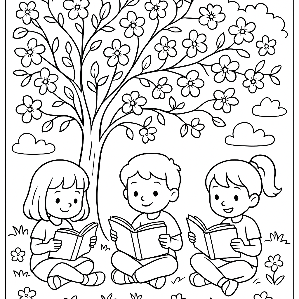 A medium coloring page featuring children reading books under a flowering tree in spring. Perfect for kids (6-9) with moderately detailed outlines for a fun coloring experience.