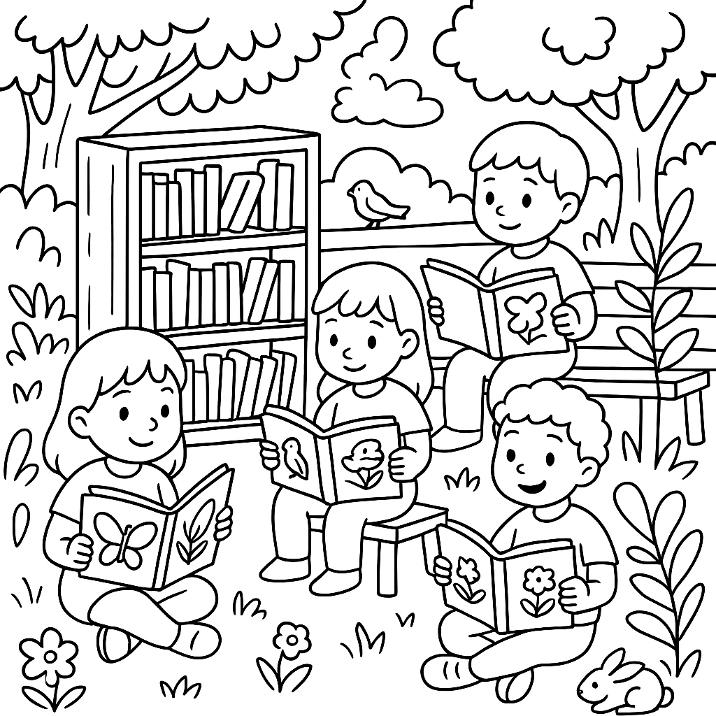 A medium coloring page featuring children reading nature books in outdoor library. Perfect for kids (6-9) with moderately detailed outlines for a fun coloring experience.