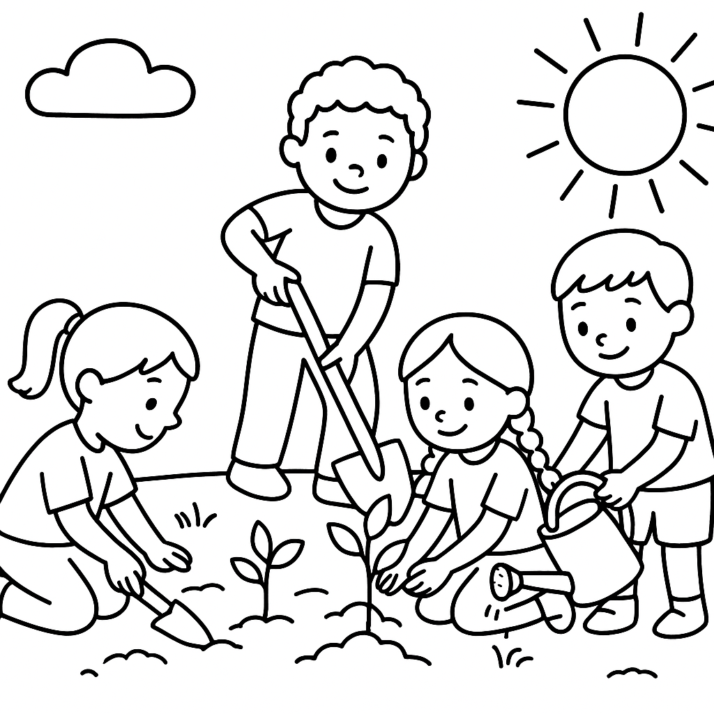 A simple coloring page featuring children cooperating to plant community garden. Perfect for kids (4-6) with large, bold outlines for a fun coloring experience.