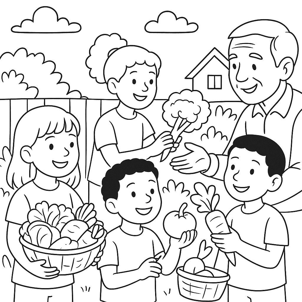 A medium coloring page featuring children sharing garden vegetables with community. Perfect for kids (6-9) with moderately detailed outlines for a fun coloring experience.