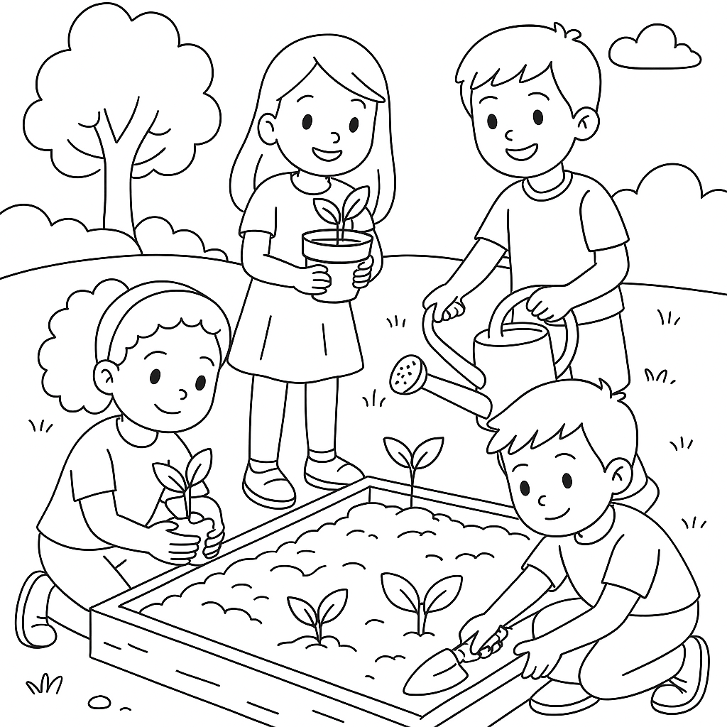 A medium coloring page featuring children working together to plant a class garden. Perfect for kids (6-9) with moderately detailed outlines for a fun coloring experience.