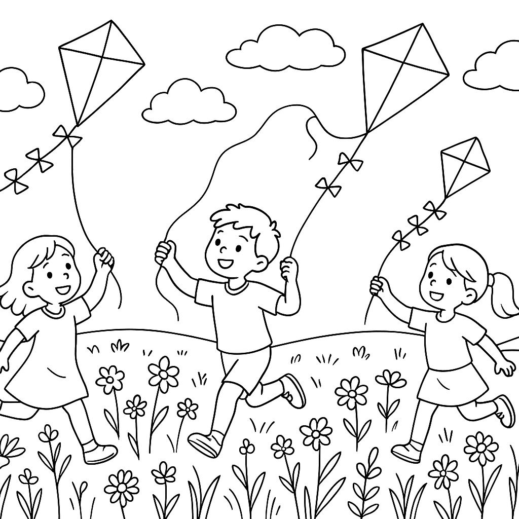 A medium coloring page featuring children flying kites in a spring meadow with wildflowers. Perfect for kids (6-9) with moderately detailed outlines for a fun coloring experience.