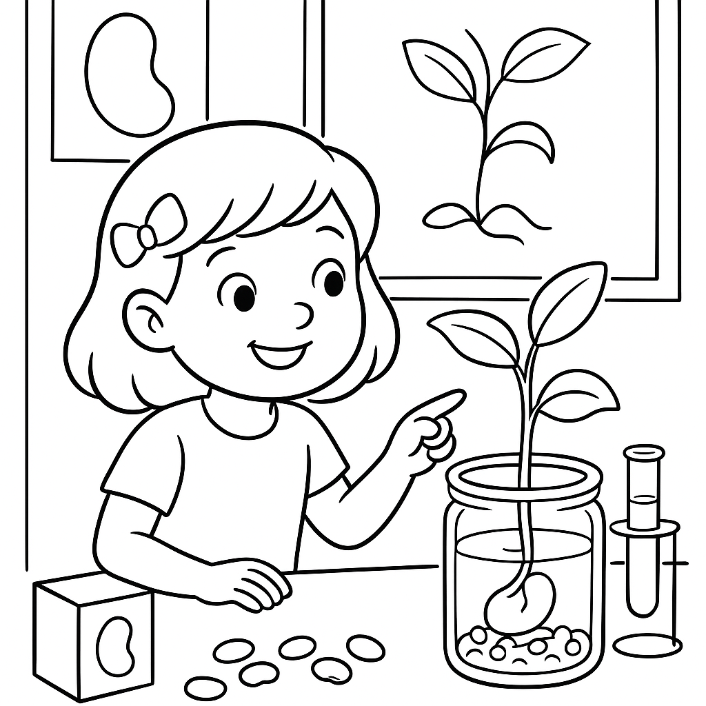 A medium coloring page featuring classroom science experiment growing beans. Perfect for kids (6-9) with moderately detailed outlines for a fun coloring experience.