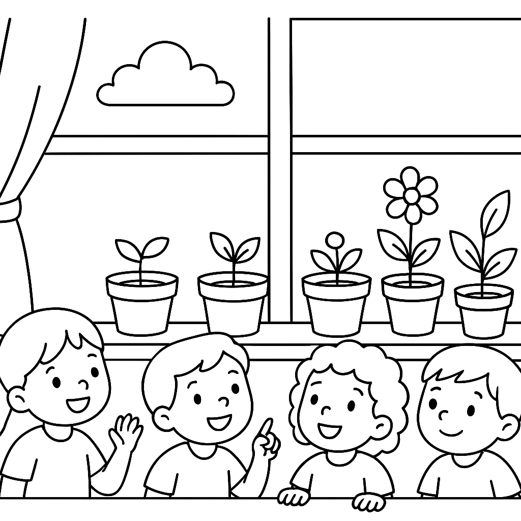 A simple coloring page featuring classroom window garden with students observing plant growth. Perfect for kids (4-6) with large, bold outlines for a fun coloring experience.
