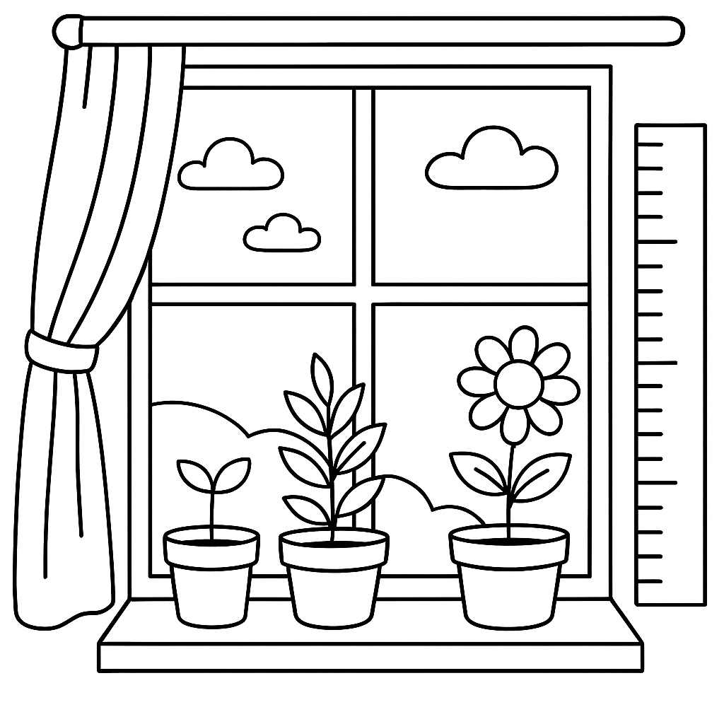 A medium coloring page featuring classroom window with potted plants and growth chart measurements. Perfect for kids (6-9) with moderately detailed outlines for a fun coloring experience.
