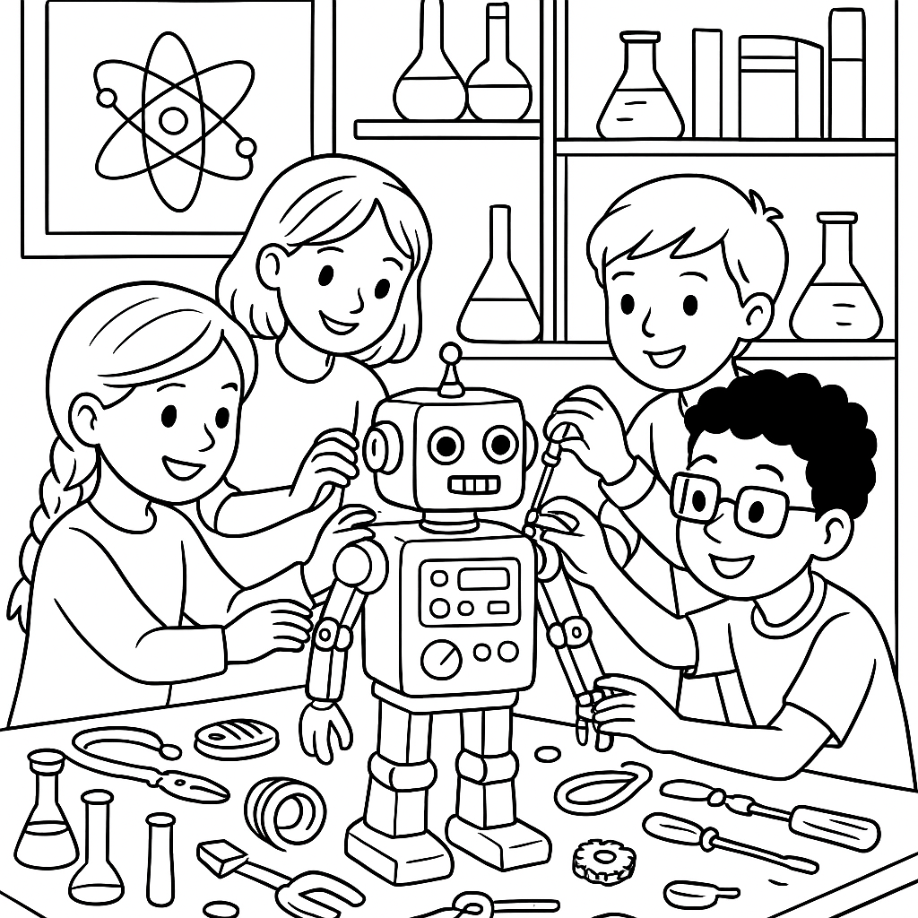 A detailed coloring page featuring students building robot in science lab. Perfect for tweens (9-12) with intricate detail for a fun coloring experience.