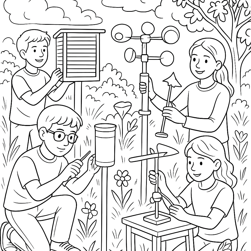 A detailed coloring page featuring students building weather stations for spring data. Perfect for tweens (9-12) with intricate detail for a fun coloring experience.