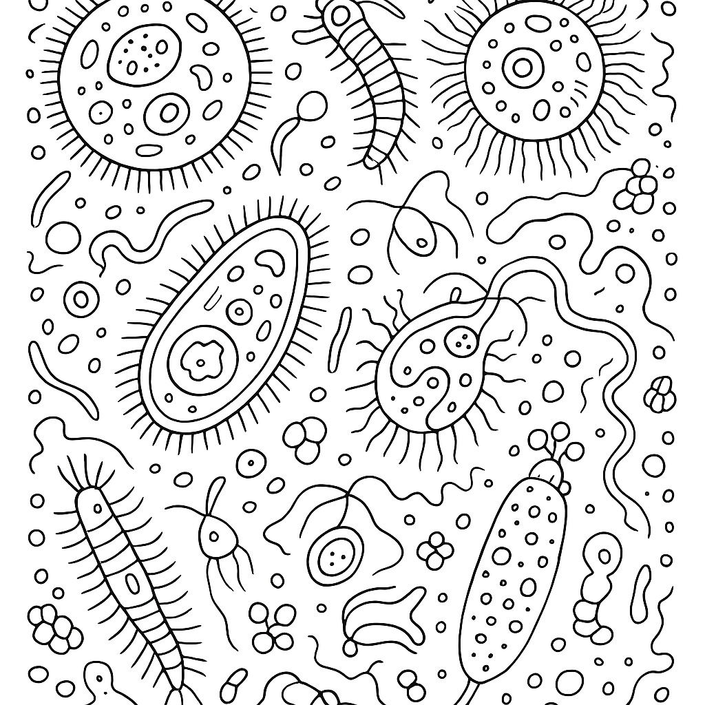 A detailed coloring page featuring microscopic view of pond water showing tiny organisms. Perfect for tweens (9-12) with intricate detail for a fun coloring experience.