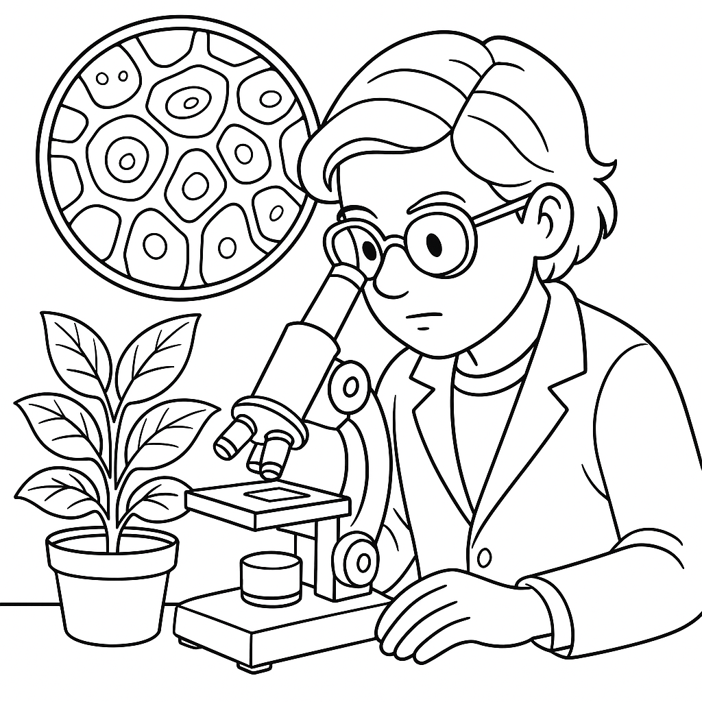 A detailed coloring page featuring a scientist examining plant cells through a microscope. Perfect for tweens (9-12) with intricate detail for a fun coloring experience.