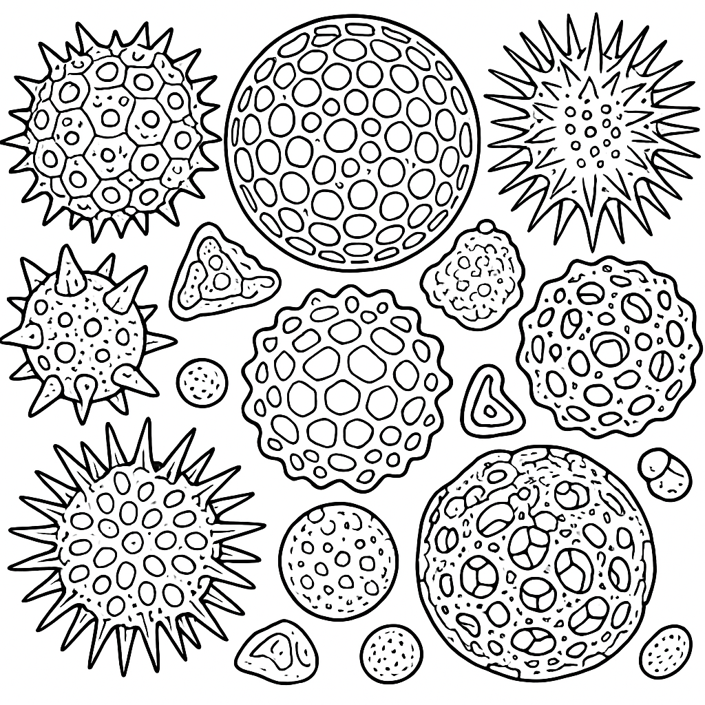 A detailed coloring page featuring microscope view of pollen grains from spring flowers. Perfect for tweens (9-12) with intricate detail for a fun coloring experience.