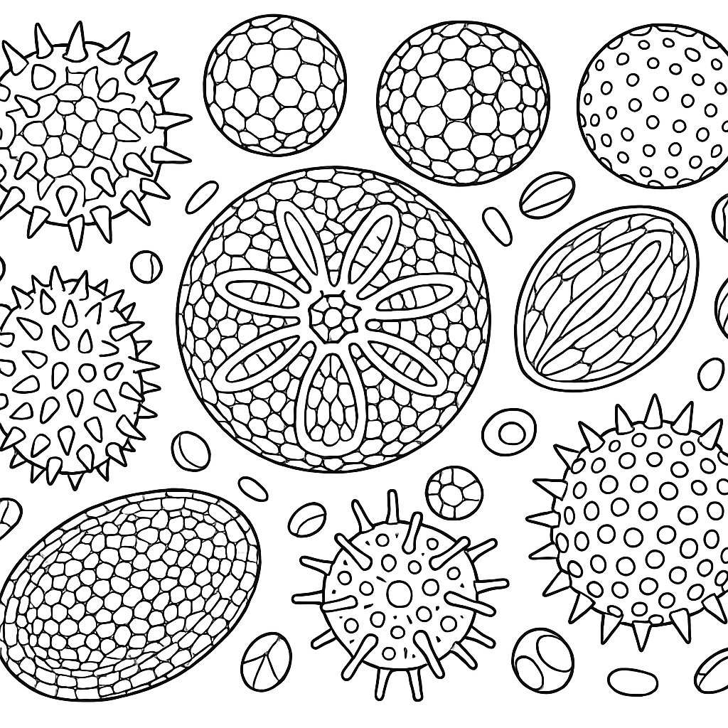 A detailed coloring page featuring microscopic view of pollen grains structure. Perfect for tweens (9-12) with intricate detail for a fun coloring experience.