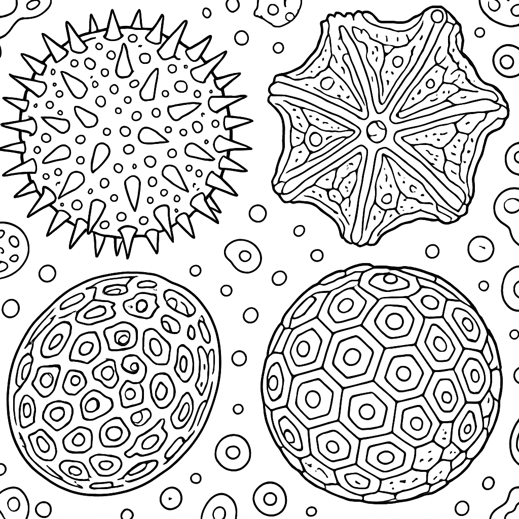 A detailed coloring page featuring pollen grains magnified showing detailed structures. Perfect for tweens (9-12) with intricate detail for a fun coloring experience.