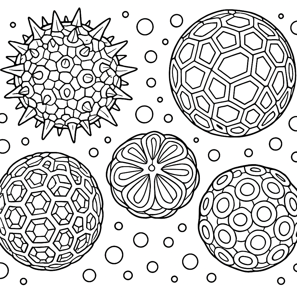 A detailed coloring page featuring pollen grains magnified showing intricate geometric shapes. Perfect for tweens (9-12) with intricate detail for a fun coloring experience.