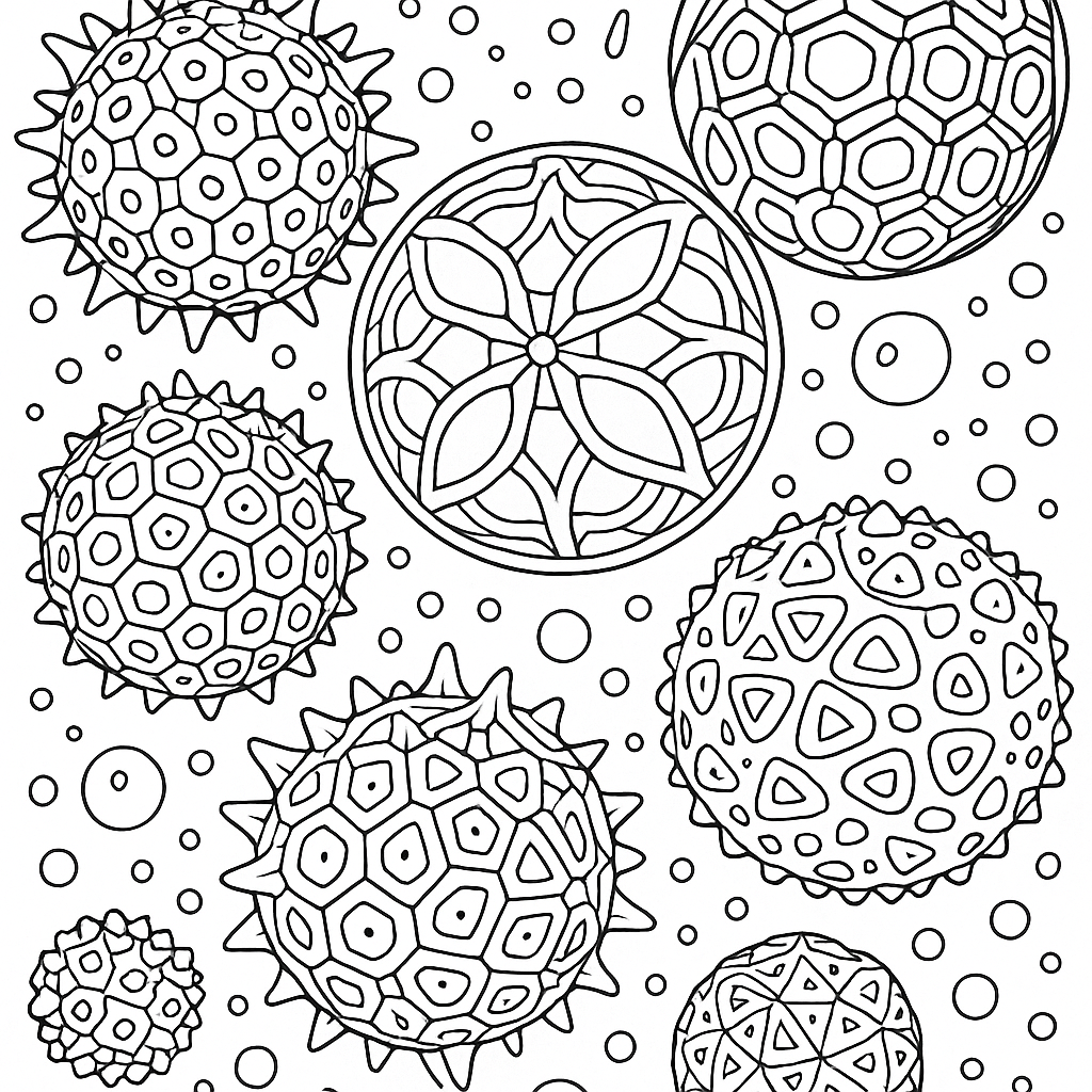A detailed coloring page featuring pollen grains under magnification with geometric patterns. Perfect for tweens (9-12) with intricate detail for a fun coloring experience.
