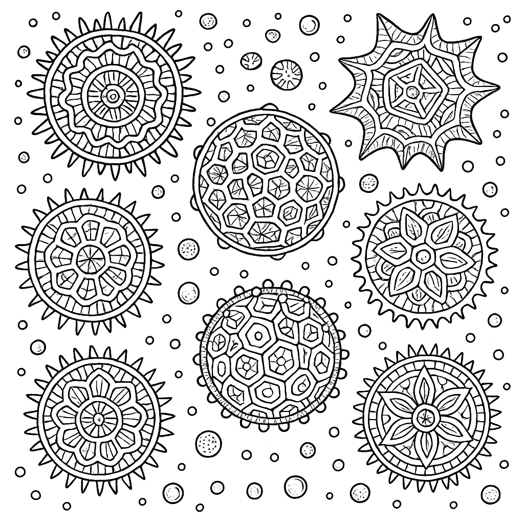 A detailed coloring page featuring pollen grains with intricate geometric patterns. Perfect for tweens (9-12) with intricate detail for a fun coloring experience.