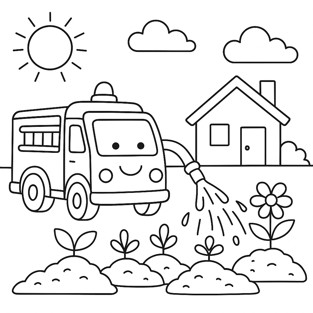 A simple coloring page featuring a fire truck helping to water a community garden. Perfect for kids (4-6) with large, bold outlines for a fun coloring experience.