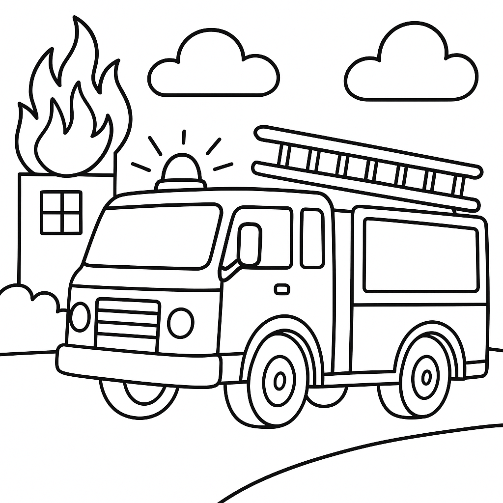 A simple coloring page featuring fire truck responding to emergency call. Perfect for kids (4-6) with large, bold outlines for a fun coloring experience.