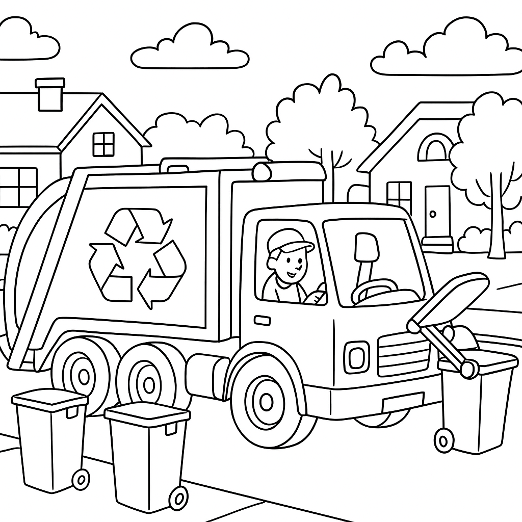 A medium coloring page featuring recycling truck collecting bins on neighborhood street. Perfect for kids (6-9) with moderately detailed outlines for a fun coloring experience.