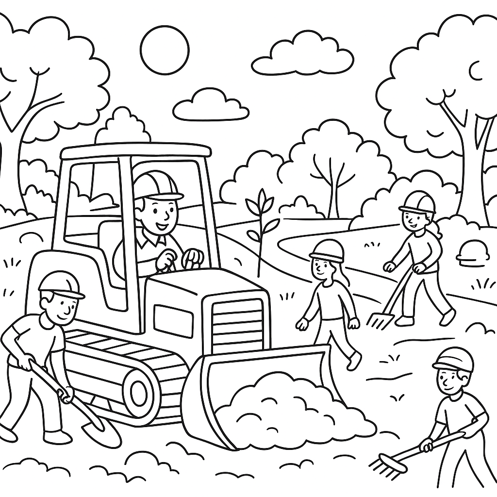A medium coloring page featuring bulldozer and crew preparing land for new park construction. Perfect for kids (6-9) with moderately detailed outlines for a fun coloring experience.