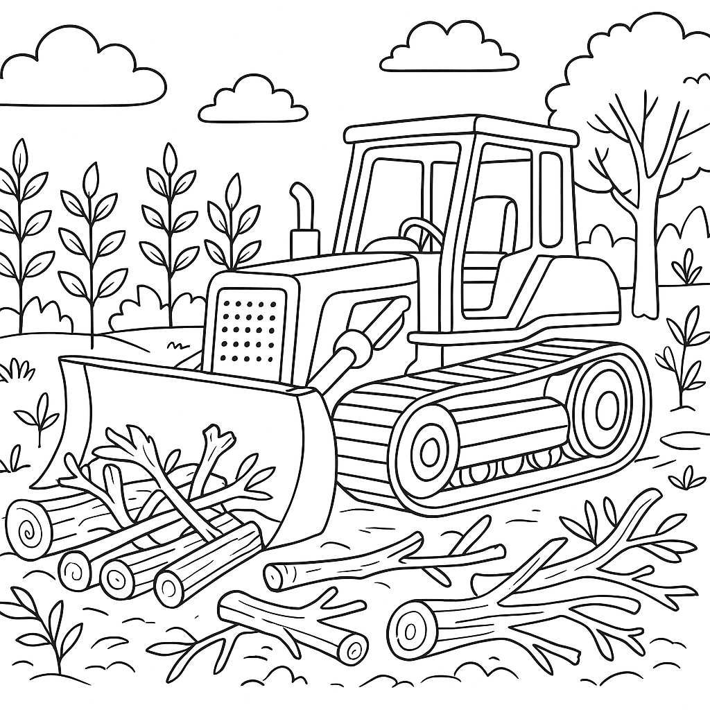 A detailed coloring page featuring bulldozer clearing land for new forest planting. Perfect for tweens (9-12) with intricate detail for a fun coloring experience.