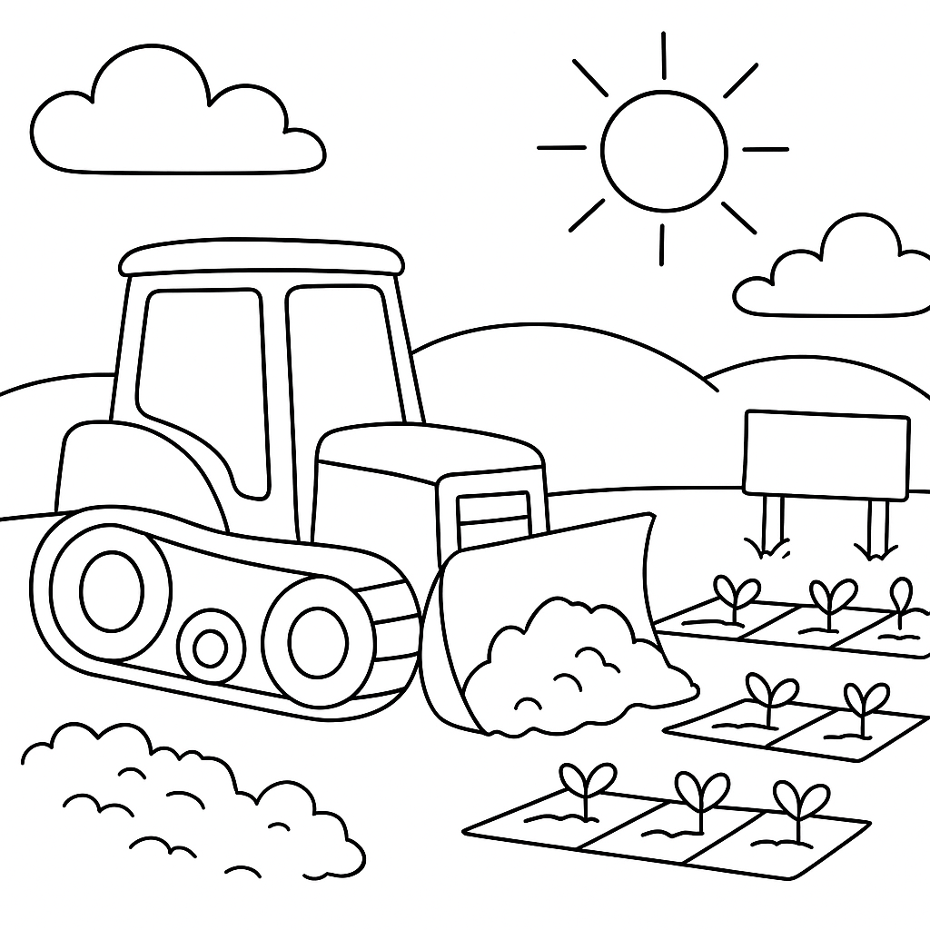 A simple coloring page featuring bulldozer preparing soil for new community garden project. Perfect for kids (4-6) with large, bold outlines for a fun coloring experience.