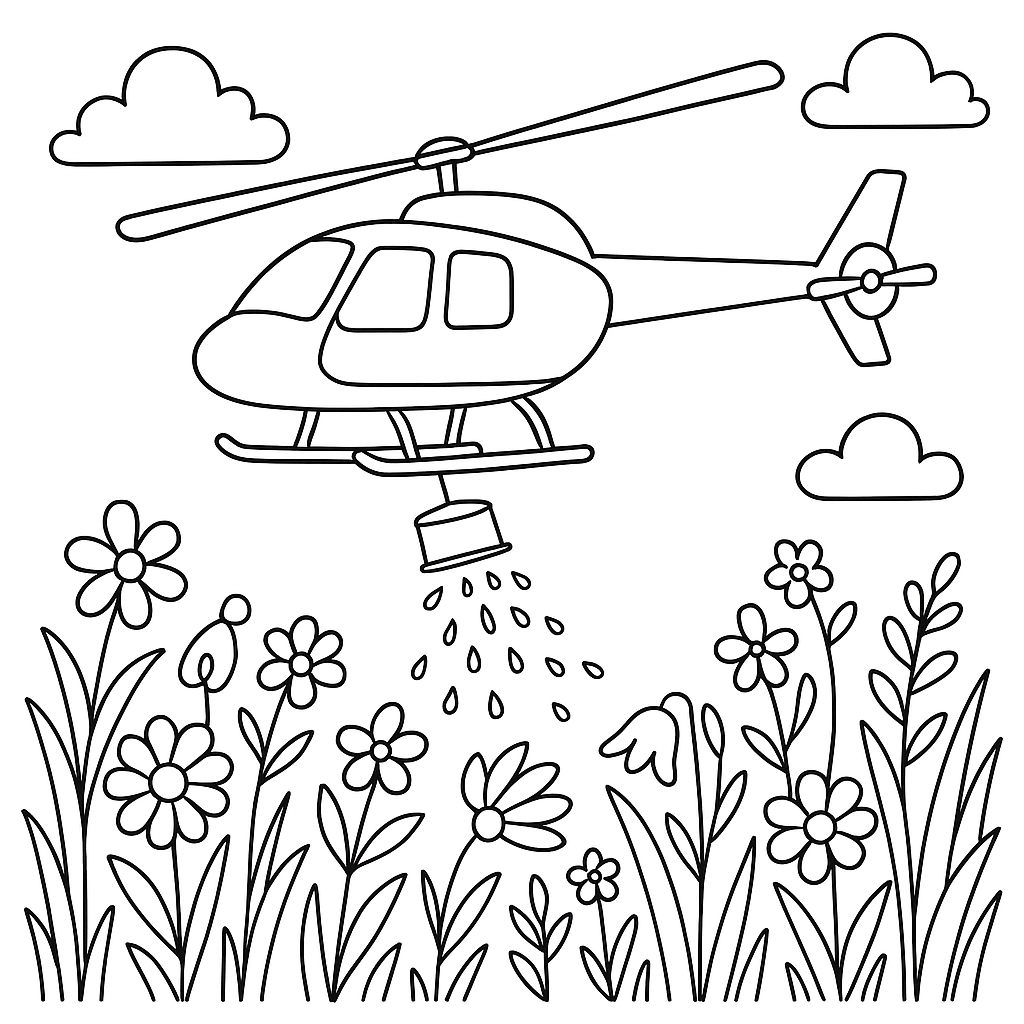 A medium coloring page featuring a helicopter dropping wildflower seeds for meadow restoration. Perfect for kids (6-9) with moderately detailed outlines for a fun coloring experience.