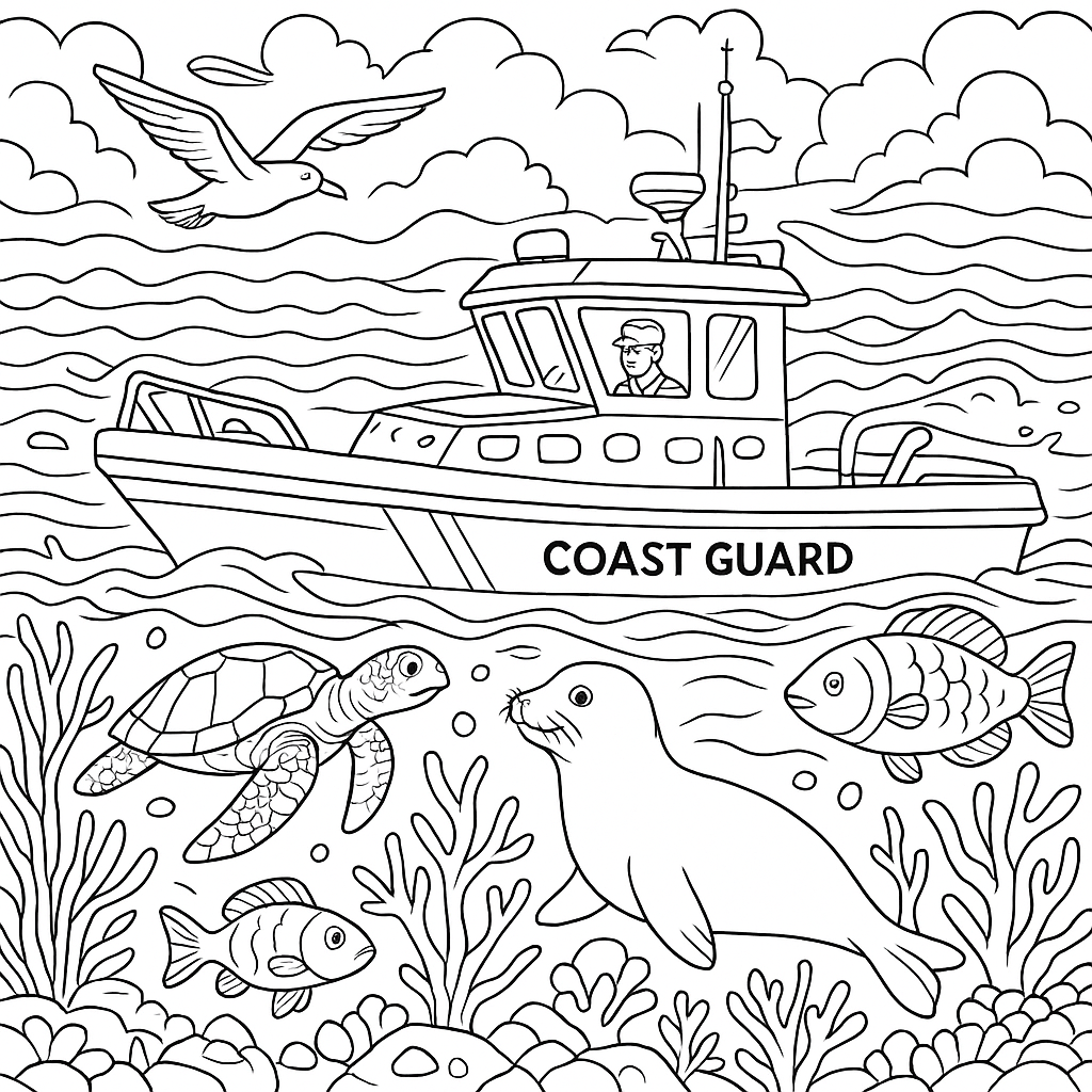 A detailed coloring page featuring coast guard boat protecting marine wildlife. Perfect for tweens (9-12) with intricate detail for a fun coloring experience.
