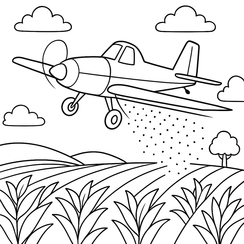 A medium coloring page featuring crop duster plane spraying organic fertilizer over spring farmland. Perfect for kids (6-9) with moderately detailed outlines for a fun coloring experience.