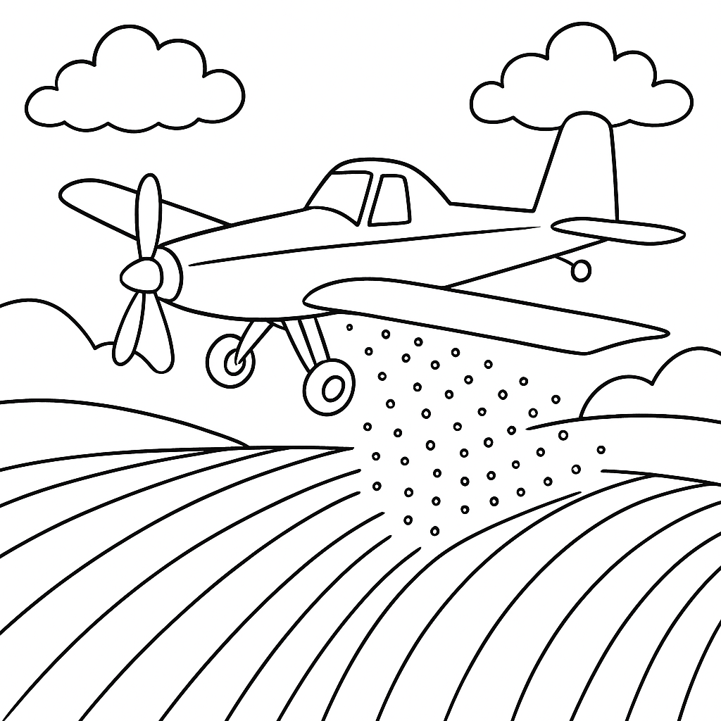 A medium coloring page featuring crop duster plane spreading seeds over farmland. Perfect for kids (6-9) with moderately detailed outlines for a fun coloring experience.